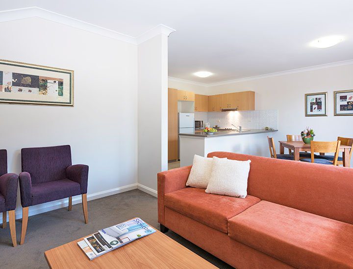 Our self-contained one and two bedroom apartments feature a separate lounge and dining area, flat screen TV with cable channels, air conditioning, free Wi-Fi (1GB), full kitchens with crockery and flatware, full sized fridge, oven, cooktop, tea/coffee making facilities, dishwasher, spa bath, plush towelling, hairdryer, and spacious balconies perfect for an evenings entertaining.